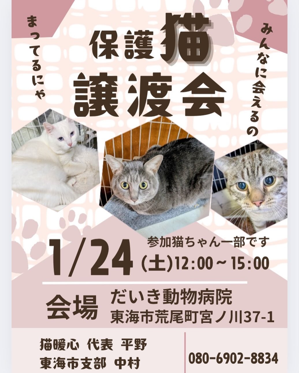 1月24日開催・東海市だいき動物病院「第8回保護猫譲渡会」のお知らせ