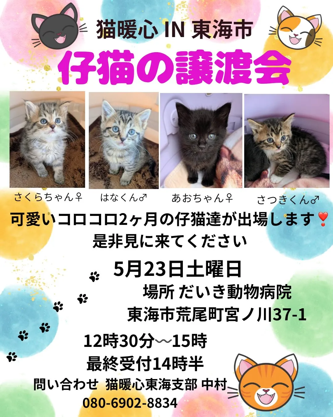 5月23日(土)開催・東海市・だいき動物病院・保護猫の譲渡会📣